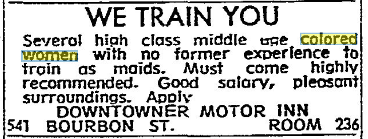 Of course, it was also common to ask for “colored” applicants for certain positions. For example, here’s an ad from 1967 by an inn on Bourbon Street.
