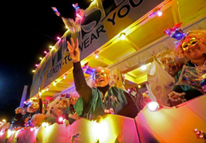 Muses is known for their humorous and sarcastic parade themes that play on pop culture references and local in-jokes. Their floats are decorated with biting satire and an intellectual wit that eclipses that of almost every other Mardi Gras parade. Some of their past themes have included New Orleans Superheroes (like SuperMuse), Makin’ Groceries, Disco (in which they rewrote humorous lyrics to classic disco songs), a Muses Shopping Mall, and in 2010 they even made a Romantic Guide to Love. Their infamous parade themes are known to be kept under tight lock and key yearlong, only to be revealed as they roll on Thursday night.