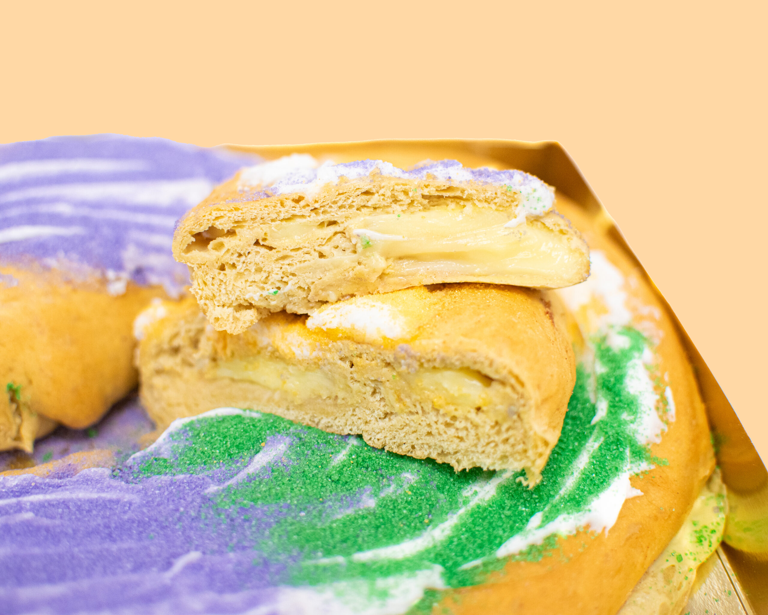Our Bavarian Cream Filled King Cake is light, fluffy and melt-in-your-mouth delicious. Filled with our perfectly balanced, sweet and creamy filling, this cake is a true crowd-pleaser that is sure to make you the hero at your next Mardi Gras celebration.
